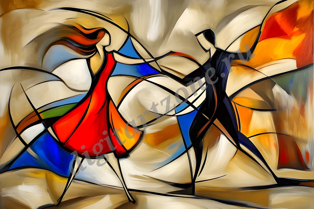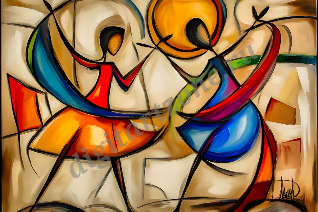 Абстрактная живопись с плавными, пересекающимися линиями и формами. На переднем плане витает энергия движения — изгибы и дуги создают ощущение динамики и вращения. Общая атмосфера картин — энергичная, динамичная и несколько загадочная: зритель может увидеть в ней движение, импульс и гармонию между хаосом и порядком.