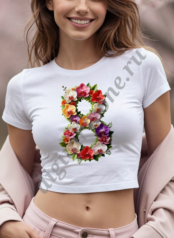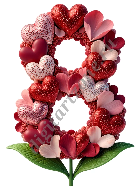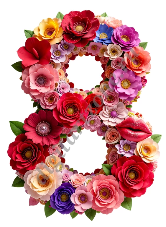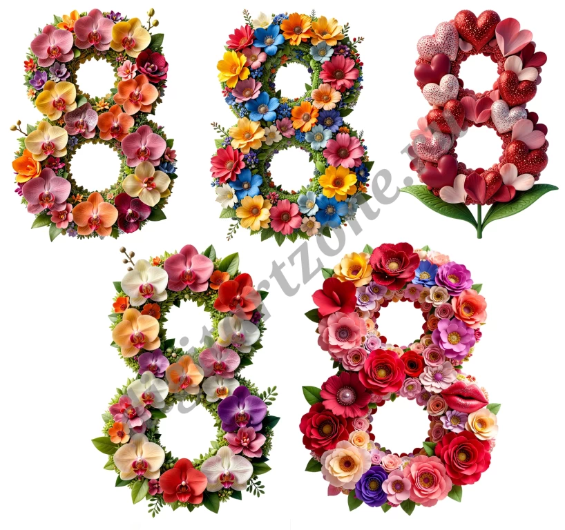 5 ярких иллюстраций цифры 8 из цветов и сердечек на прозрачном фоне,