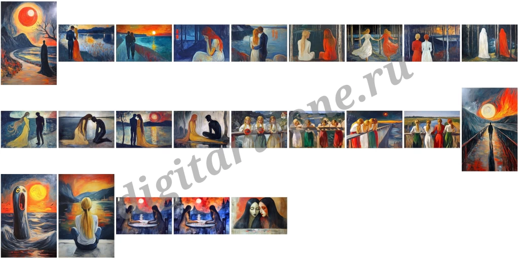 Подборка из 23 картин в стиле Эдварда Мунка.