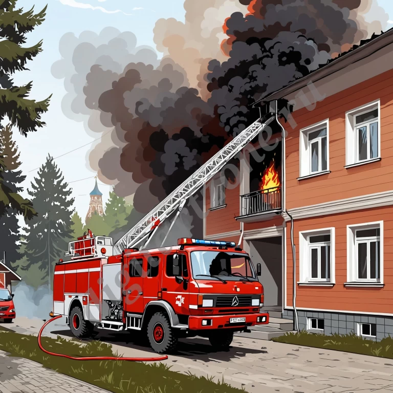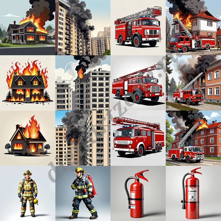 В наборе пожарные рабочие, пожарные автомобили, огнетушители, горящие дома и квартиры, тушение пожара.