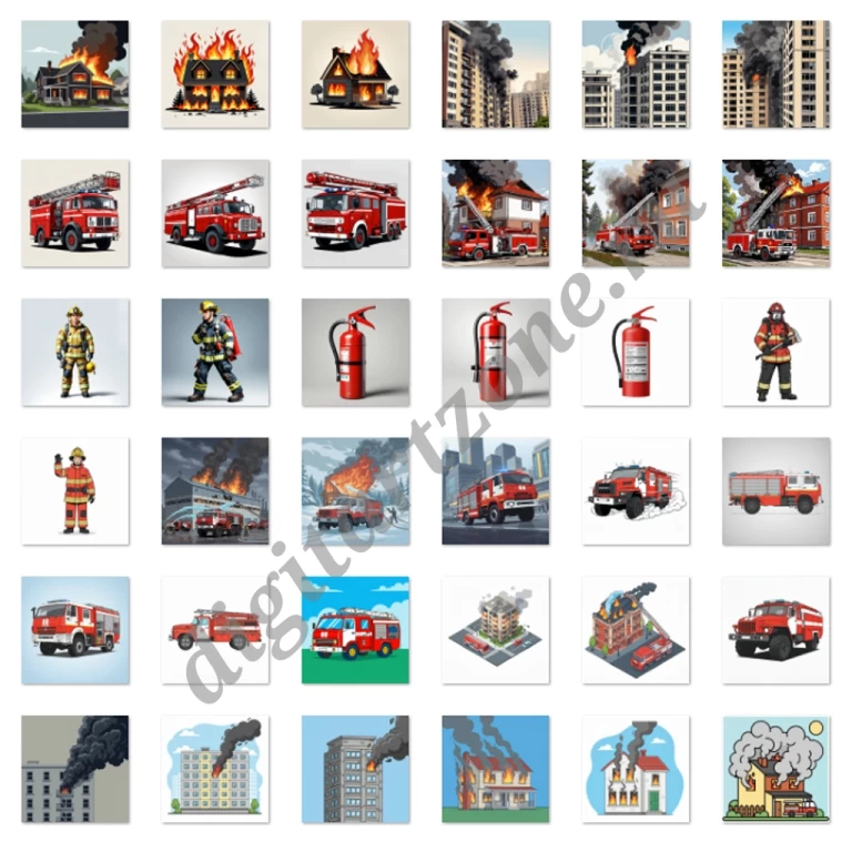 В наборе пожарные рабочие, пожарные автомобили, огнетушители, горящие дома и квартиры, тушение пожара.