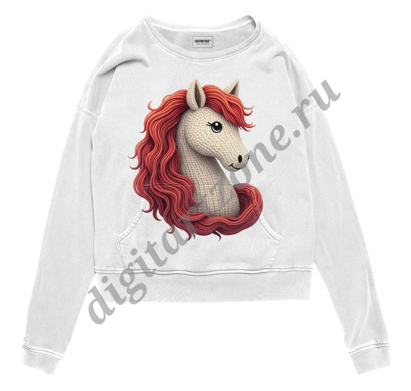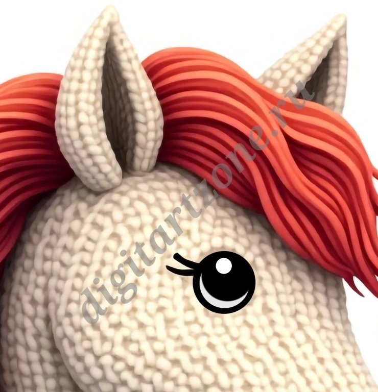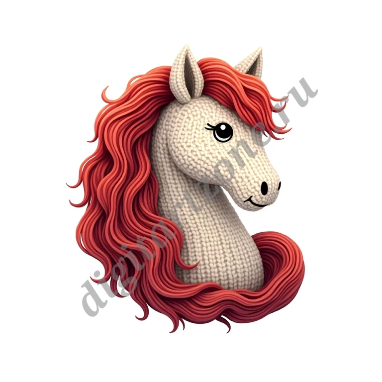 Красивая вязаная лошадка на белом фоне. Символ года 2026. Пример использования - печать календарей, печать на одежде, печать открыток, обложек для блокнотов, тетрадей и т.д.