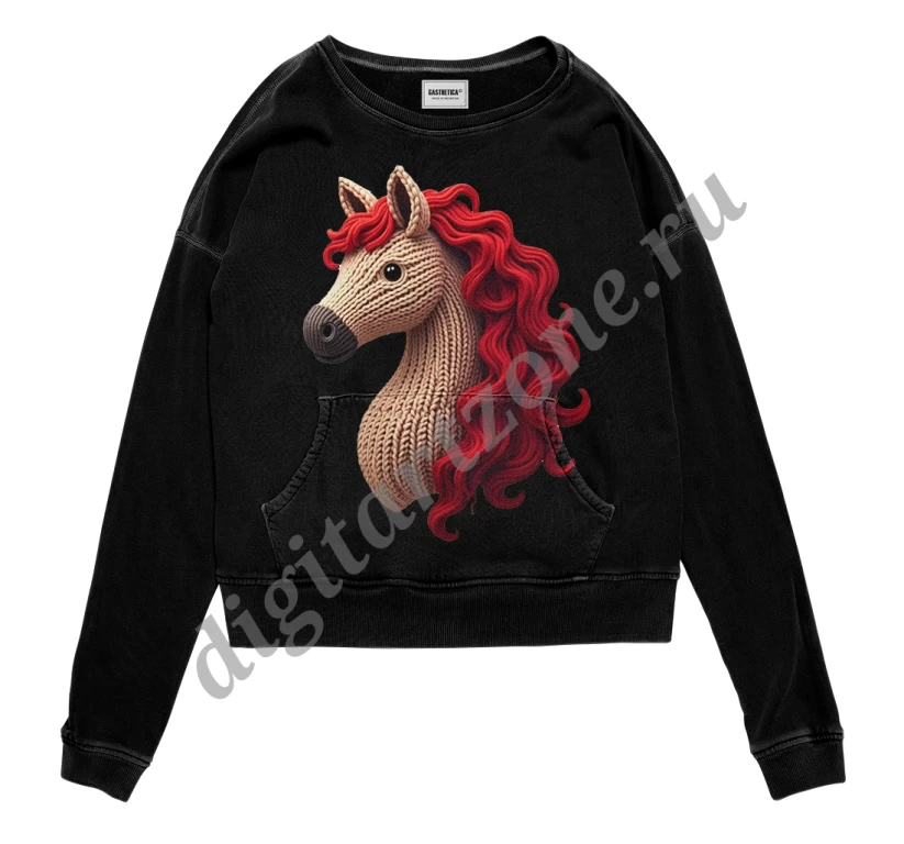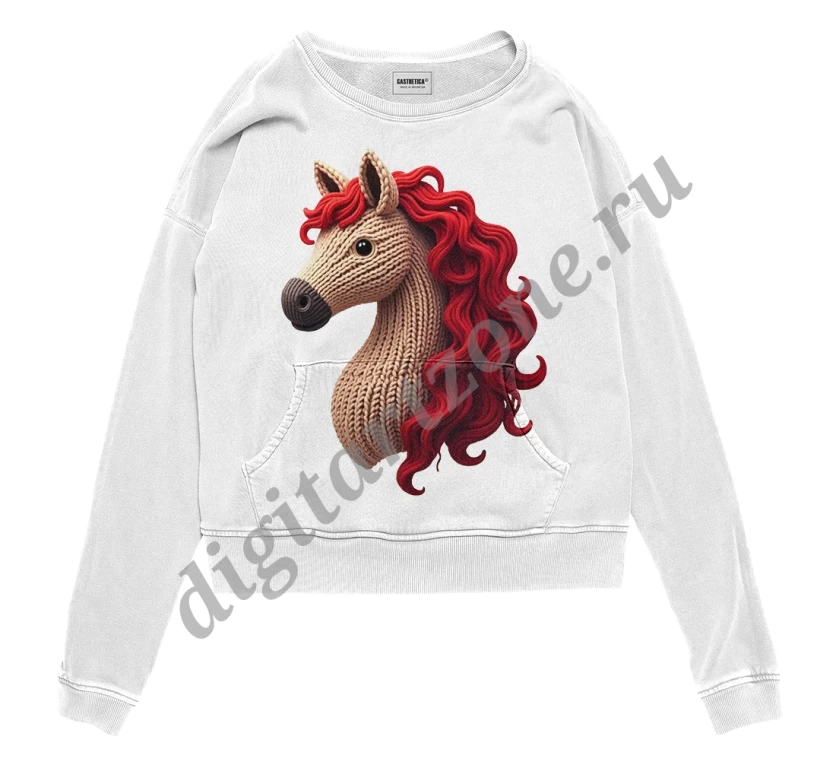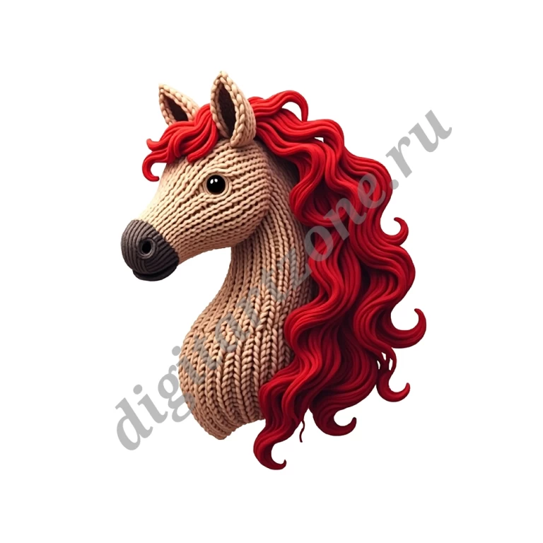 Красивая вязаная лошадка на белом фоне. Символ года 2026. Пример использования - печать календарей, печать на одежде, печать открыток, обложек для блокнотов, тетрадей и т.д.