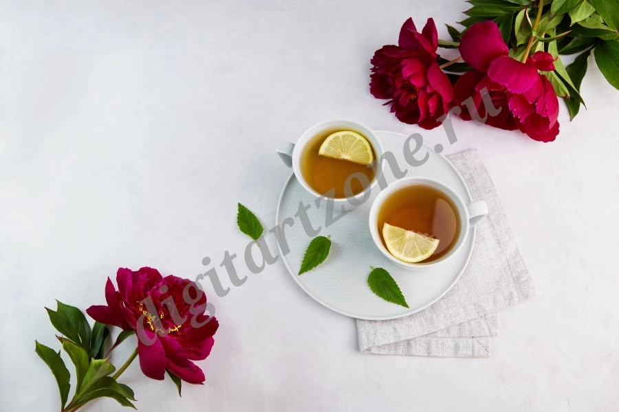 Чашки чая с лимоном. Красные цветы пионов на сером фоне.