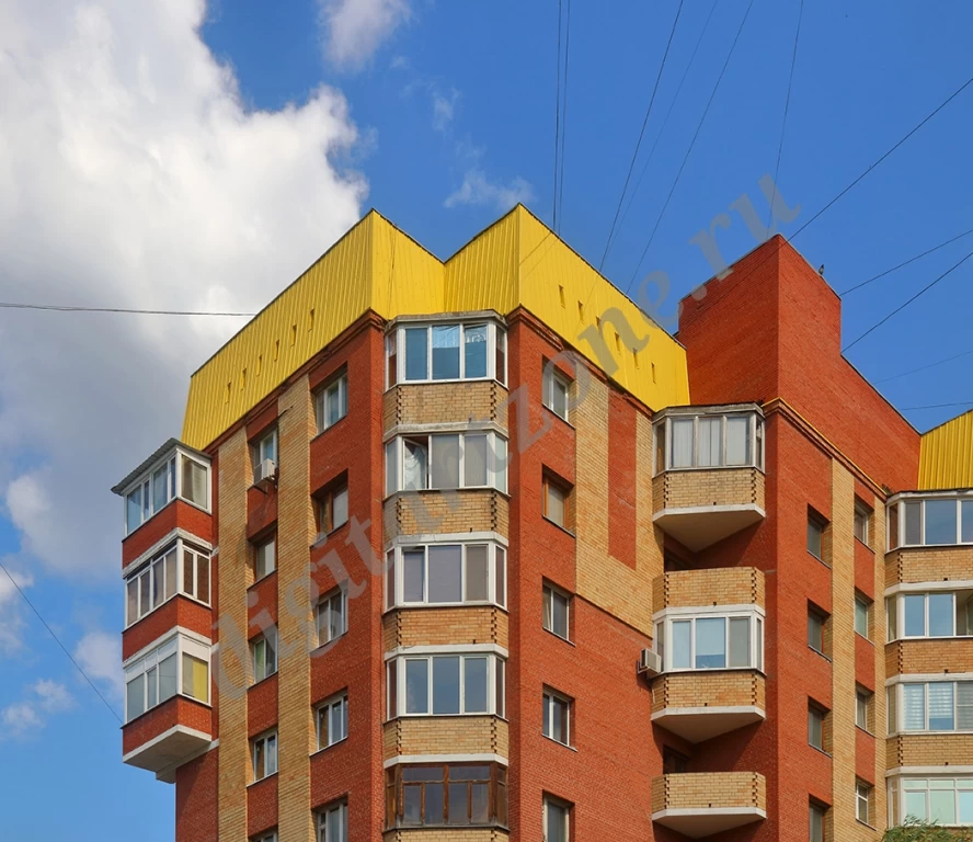 Фотография многоэтажного кирпичного жилого дома.
