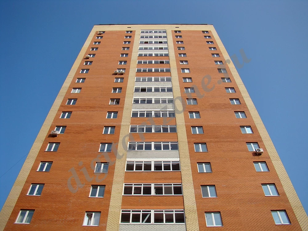 Фотография многоэтажного дома в перспективе на фоне голубого неба.