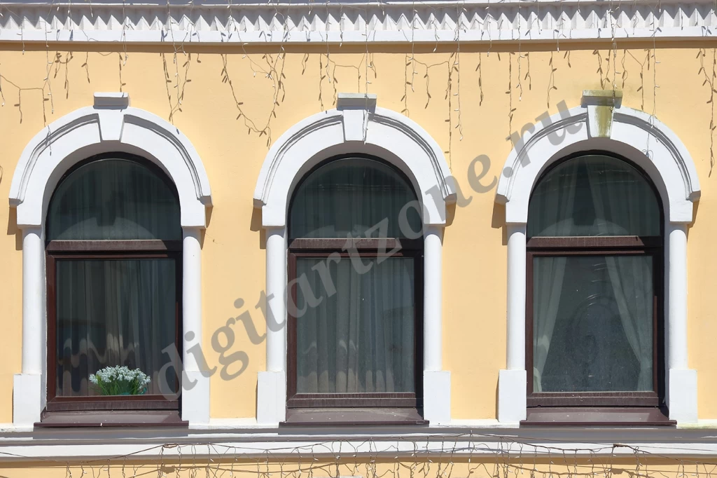 Фотография окон здания в классическом стиле.