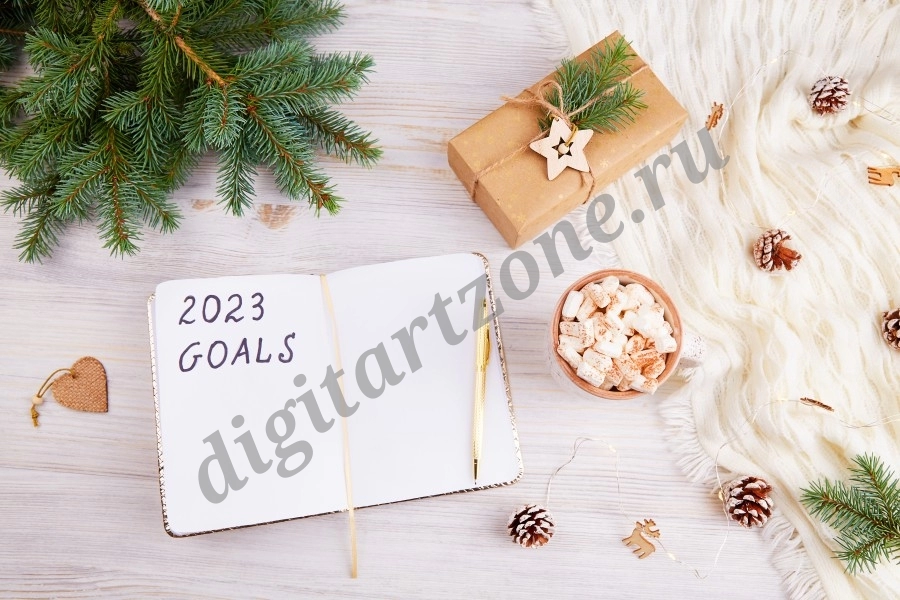 Открытая записная книжка с текстом из букв "Цели 2023". Планировщик, чашка какао или горячего шоколада с зефиром, подарок в крафт-бумаге, еловые ветки и рождественские украшения.