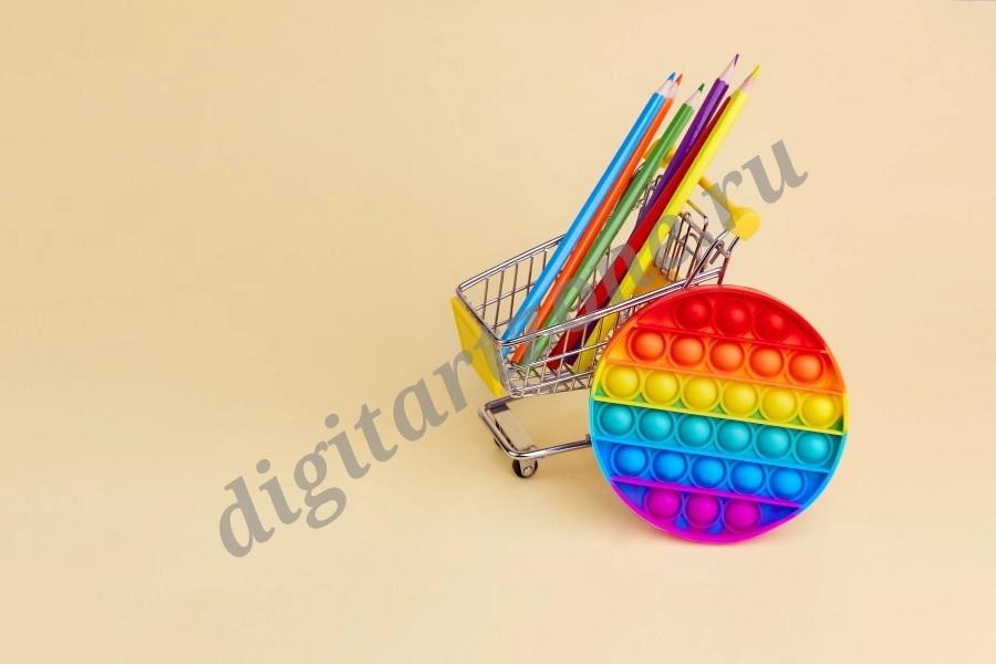 Популярная игра Pop it и цветные карандаши в тележке супермаркета на желтом фоне. Модная радужная антистрессовая игрушка.