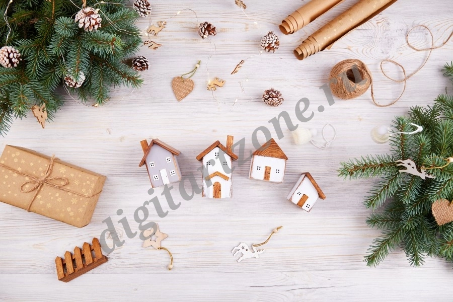 Поздравительная открытка с Рождеством. Игрушечные деревянные домики, подарок, еловые ветки, подарочная оберточная бумага на светлом фоне.