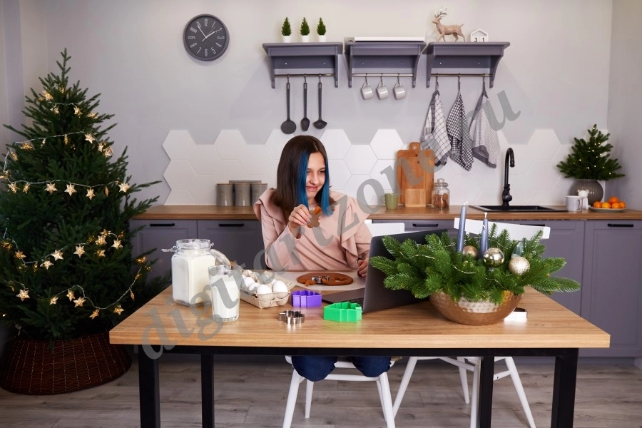 Счастливая девушка показывает печенье на экране ноутбука. Онлайн мастер-класс по приготовлению рождественских пряников в домашних условиях. Традиции празднования Рождества и Нового года.