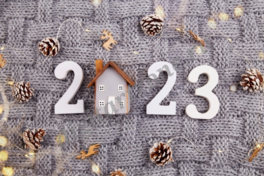 Счастливого Рождества и Нового 2023 года. Деревянные цифры 2023 и игрушечный домик на вязаном фоне с рождественским декором. Вид сверху.