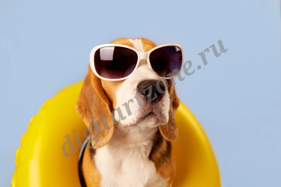Собака породы бигль в солнцезащитных очках и круге для плавания на