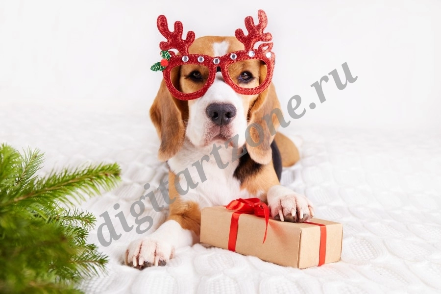 Собака породы бигль в забавных рождественских очках лежит на кровати. Поздравительная открытка с Новым годом и Рождеством с домашним животным.