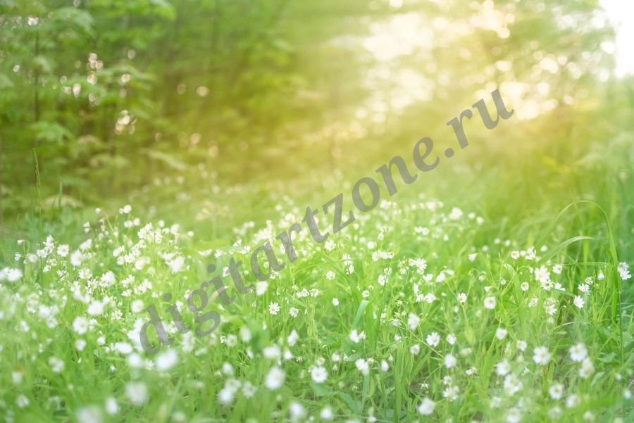 Лесная поляна с белыми цветами, залитая солнечными лучами. Пейзаж, летний фон.