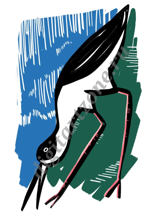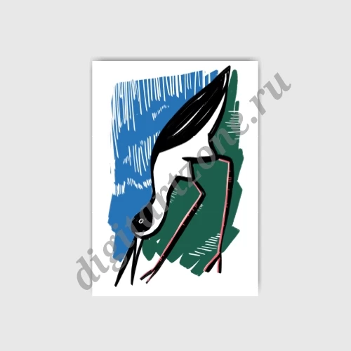 На изображении представлена цапля, стоящая на одной ноге в характерной для нее позе. Птица изображена в стилизованной манере, с акцентом на ее характерные черты: длинный клюв, изогнутую шею и длинные ноги. Фон выполнен в синих и зеленых тонах, что создает контраст и подчеркивает грацию птицы.