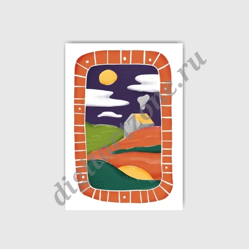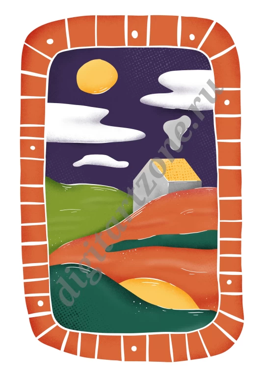 На изображении представлен стилизованный рисунок, изображающий закат в деревне. На переднем плане видны зеленые холмы и оранжевая река, что создает ощущение тепла и уюта. В центре изображения расположен дом с желтой крышей и серыми стенами, что добавляет композиции контраста. На заднем плане виден фиолетовый небосвод с белыми облаками и желтым солнцем, что создает атмосферу спокойствия и умиротворения.