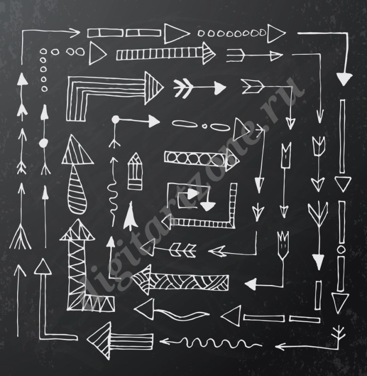 Белые стрелочки на черном фоне. Нарисованный от руки скетч. Векторная иллюстрация.