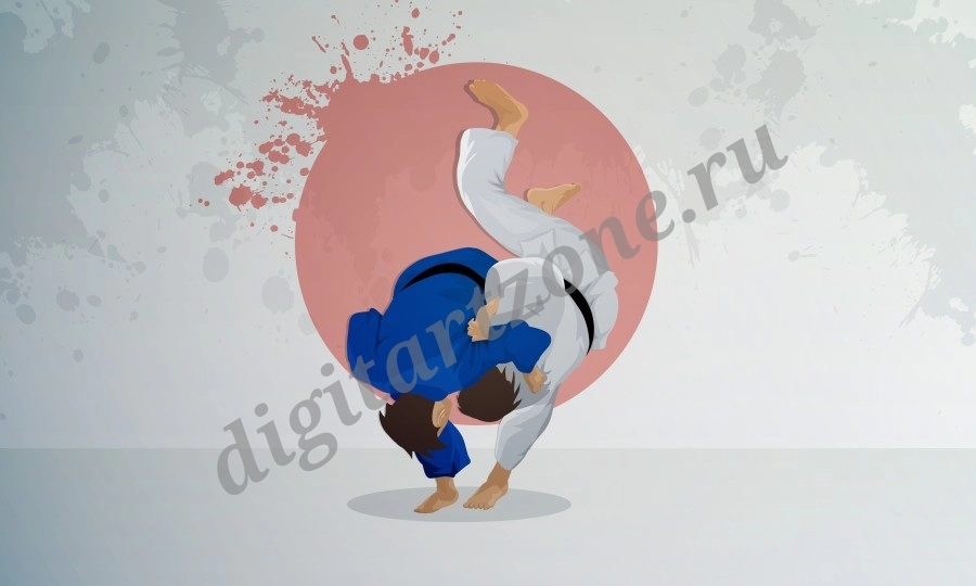 Борец в синем кимоно делает бросок. Дзюдо восточная борьба.