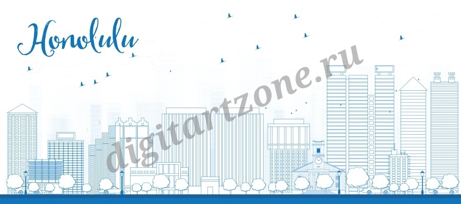 Гонолулу. Штат Гавайи. США. Голубые здания и место для текста. Контурная иллюстрация.