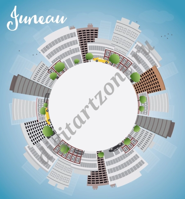 Город Джуно. Столица Аляски. США. Серые здания на голубом фоне и место для текста. Векторная иллюстрация.