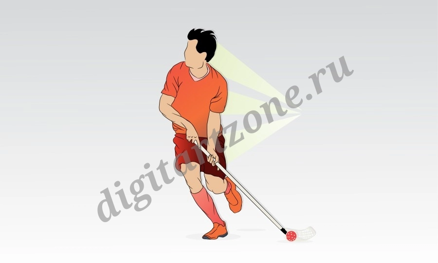Игрок с флорбольной клюшкой и мячом бежит.
