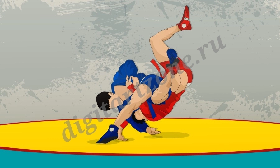 Мужчины-борцы в красно-синих кимоно в русской национальной борьбе. Спортсмен делает бросок через плечо.