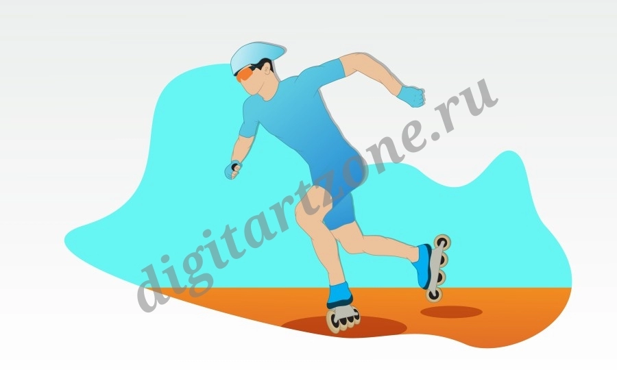 Спортсмен бежит по дорожке на роликовых коньках в синем спортивном костюме и защитном шлеме. Абстрактный фон