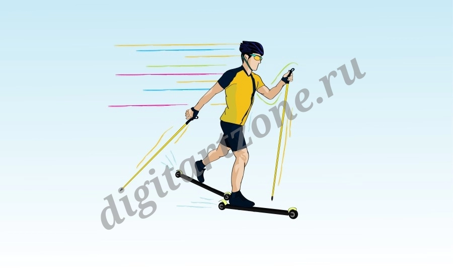 Спортсмен на роликовых лыжах, с лыжными палками.