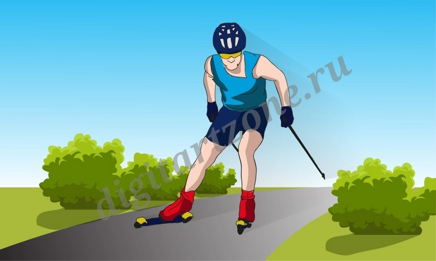 Спортсмен тренируется, катается на роликовых лыжах в шлеме и с лыжными палками. Роликовые виды спорта. Летняя иллюстрация мужчины на роликовых лыжах.